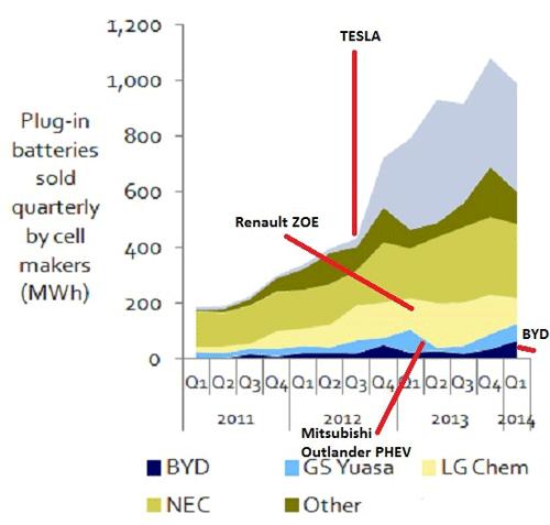 作為世界級電池大廠,圖表底部顯示的是比亞迪的電池市場份額分布,由于中國電動大巴的大額訂單和插電式混合動力汽車“秦”的熱銷,導致比亞迪電池市場份額不斷增長。