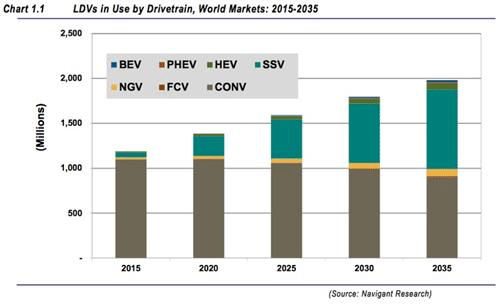 日前,Navigant Research公司發(fā)布報(bào)告稱,到2035年微混(啟停車型)、混動(dòng)車、天然氣車和電動(dòng)車將總計(jì)占據(jù)車市的55%份額,超過(guò)傳統(tǒng)內(nèi)燃汽車銷量。