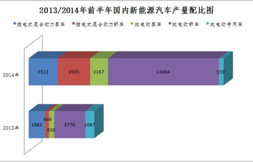2014年上半年國內新能源車型產量共計23638輛,同比2013年上半年增長率近200%,新一輪示范推廣補貼政策帶來的市場推動效果顯而易見。其中插電式混合動力車型共計生產7448輛,同比增長超過200%,包括插電式混合動力乘用車3935輛,插電式混合動力客車3513輛;純電動車型產量16190輛(含鉛酸電池車型3765輛),同比增長194%,包括純電動乘用車13464輛,純電動客車2167輛,純電動專用車559輛。