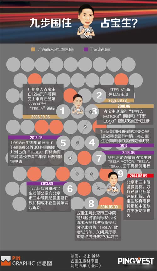 2011年以來,特斯拉一直竭力解決它在中國的商標權(quán)問題。而在經(jīng)過起訴、庭審等一系列拉鋸戰(zhàn)后,特斯拉終于贏得了與占寶生關(guān)于商標、著作權(quán)、不正當競爭等一系列知識產(chǎn)權(quán)的案件。PingWest的信息圖帶你回顧,特斯拉是如何一步步圍住中國商人的。
