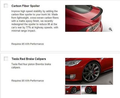特斯拉目前在美國市場的銷售模式相當透明,各種選配件清晰明了,消費者可以選到符合自身需求的車款,包括碳纖維尾翼、紅色四活塞Brembo卡鉗、快速充電器、LED日行燈、LED轉向燈、電動收折后視鏡、Nappa真皮內飾、車內LED氣氛燈等,這些都能加價選配。