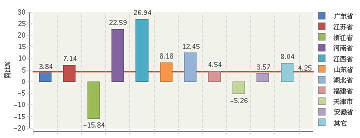 圖10 :2014年1~6月全國電池行業(yè)累計主營業(yè)務(wù)收入主要地區(qū)同比增長情況