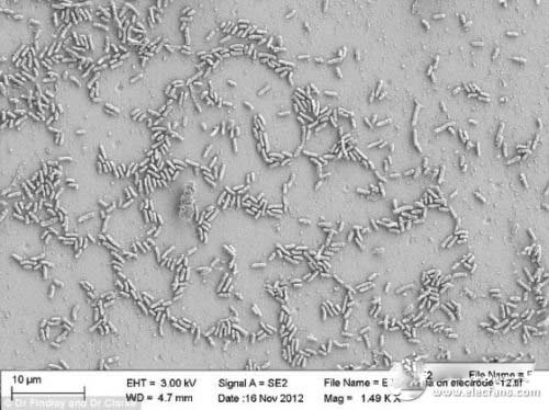 通過顯微鏡看到,海洋細菌希瓦氏菌的合成版本與碳電極發(fā)生互動