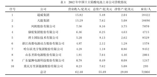 中國的鉛酸蓄電池產(chǎn)業(yè)市場分布狀況是,起動電池產(chǎn)量7495萬kVAh,動力電池5320萬kVAh,工業(yè)用電池1601萬kVAh。所占總體比例分別是:52%、37%和11%(2012年統(tǒng)計數(shù)據(jù))。2011年,受國家環(huán)境整治風(fēng)暴影響,對鉛酸電池行業(yè)進行了大洗牌,其結(jié)果是加速行業(yè)整合,利好于那些規(guī)模較大、管理規(guī)范的龍頭企業(yè)。政府通過環(huán)境大整治,樹立了行業(yè)新標(biāo)桿,達(dá)到優(yōu)勝劣汰,促進行業(yè)規(guī)范化發(fā)展,也使行業(yè)內(nèi)企業(yè)規(guī)模和數(shù)量發(fā)生巨大變化。《鉛蓄電池行業(yè)準(zhǔn)入條件》實施以后,全國鉛酸蓄電池企業(yè)80%被關(guān)停并轉(zhuǎn),企業(yè)數(shù)量從3000多家下降到約500家。從規(guī)模結(jié)構(gòu)上看,2011年整治以前,大、中、小型企業(yè)所占比例分別是12%、30%和58%,到2013年分別為38%、44%、18%(大型企業(yè)指年產(chǎn)值10億以上的企業(yè);中性企業(yè)指年產(chǎn)值1~10億元的企業(yè);小型企業(yè)指年產(chǎn)值1億以下的企業(yè))。2012年鉛酸蓄電池行業(yè)受到下游汽車、電動自行車和摩托車等市場穩(wěn)定增長的影響,全年產(chǎn)量增長達(dá)到12%左右,其中密封鉛酸蓄電池出口量為1.32億只,增長12%,出口額17.32億美元。起動鉛酸蓄電池出口量2096萬只,增長39.3%,出口額3.78億美元。2012年全國鉛酸蓄電池總產(chǎn)量為16120萬kVAh,銷售收入達(dá)到1080億元。根據(jù)上市企業(yè)銷售收入,2012年排名全國前十位鉛酸電池生產(chǎn)企業(yè)的營收情況見表1。