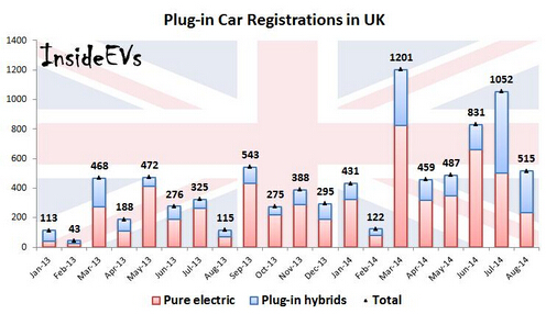 2014年8月,英國插電式混合動力車注冊量下降至515臺。但跟去年同期相比,增幅達(dá)348%。