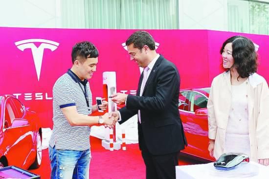 在特斯拉成都交車儀式上,特斯拉全球高級副總裁紀(jì)龍向成都車主遞交車鑰匙