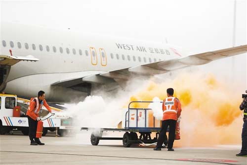 10月28日,重慶機場舉行危險品應急處置聯合演練。機場工作人員正在用滅火器控制“火勢”。