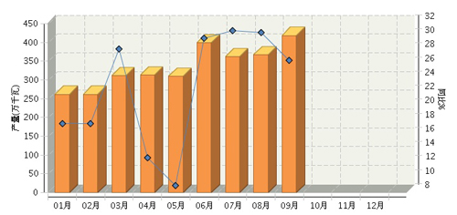 根據國家統計局公布數據,全國太陽能電池行業累計完成產量3,382.47萬千瓦,同比增長27.30%。其中:9月份完成產量418.53萬千瓦,同比增長26.74%。2014年全國太陽能電池行業月度產量及同比如上圖所示。
