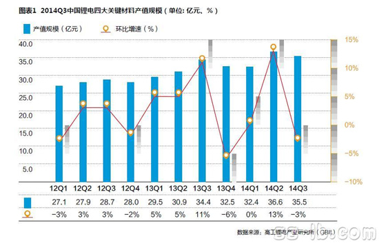 GBII:2014第三季度鋰電四大關鍵材料產值環比下降3%