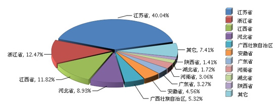 根據國家統計局公布數據,全國太陽能電池行業累計完成產量3,382.47萬千瓦,同比增長27.30%。比重主要集中在江蘇、浙江、江西、河北、廣西、安徽地區。其中:江蘇省完成累計產量1354.47萬千瓦(占40.04%),同比增長28.29%;浙江省完成累計產量421.87萬千瓦(占12.47%),同比增長30.25%;江西省完成累計產量399.77萬千瓦(占11.82%),同比增長-6.32%;河北省完成累計產量301.98萬千瓦(占8.93%),同比增長21.17%;廣西壯族自治區完成累計產量179.8萬千瓦(占5.32%),同比增長88.43%;安徽省完成累計產量154.34萬千瓦(占4.56%),同比增長178.12%。