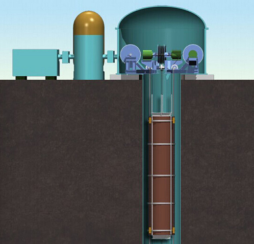其實,可以將這一系統(tǒng)看成一個巨大的鐘錘,用密度高又便宜的金屬制成的圓柱形重物用些鋼纜或繩子(現(xiàn)代高強度合成纖維最好不過)吊在洞中,每條繩索連接一個絞車,儲電時抬高重物,放電時降低重物。所有的繩索張力是能夠自動平衡同步的,這可以防止重物擺動而傷害到軸承等部件。整個絞盤系統(tǒng)可以通過電驅(qū)動器精確控制,保持重物的平穩(wěn)。