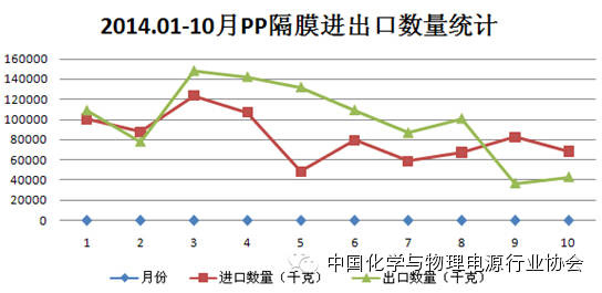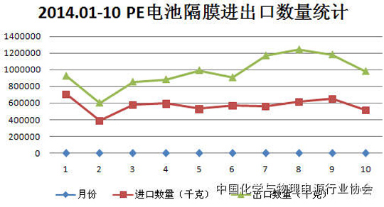 2014年10月,我國(guó)進(jìn)口乙烯聚合物制電池隔膜共511755千克,進(jìn)口額為3314萬(wàn)美元,出口數(shù)量為471587千克,出口額為226萬(wàn)美元。本年度至10月累計(jì)進(jìn)口乙烯聚合物制電池隔膜量為5683565千克,累計(jì)進(jìn)口額為30250萬(wàn)美元。累計(jì)出口乙烯聚合物制電池隔膜量為4075074千克,累計(jì)出口額為2799萬(wàn)美元。