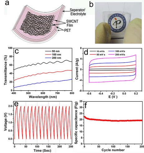 圖2 (a)透明超級電容器結(jié)構(gòu)示意圖及(b)光學(xué)照片;(c)不同厚度碳納米管薄膜組裝的超級電容器的透光率,柔性透明碳納米管薄膜超級電容器(50 nm)(d)不同掃描速率下的CV曲線;(e)恒電流充放電曲線;(f)比電容隨充放電次數(shù)的變化。