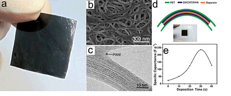 圖3 (a)超薄碳納米管/聚苯胺異質(zhì)結(jié)構(gòu)薄膜的光學(xué)照片;(b)SEM圖像和(c)TEM圖像;(d)柔性透明碳納米管超級電容器的示意圖及光學(xué)照片;(e)沉積聚苯胺不同時(shí)間碳納米管/聚苯胺薄膜超級電容器電極的質(zhì)量比電容。