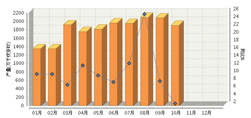 根據國家統計局公布數據,2014年1~10月全國鉛酸蓄電池行業累計完成產量18,740.30萬千伏安時,同比增長10.00%。其中:10月份完成產量1904.61萬千伏安時,同比增長2.55%。2014年全國鉛酸蓄電池行業月度產量及同比如下圖所示。