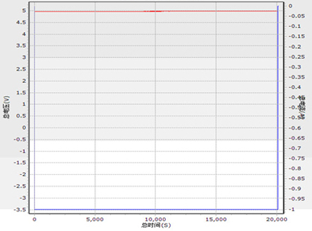 以下提供試驗(yàn)中記錄的圖表,其中藍(lán)色的曲線代表放電電流,數(shù)值見右側(cè)坐標(biāo);紅色曲線代表放電電壓,數(shù)值見左側(cè)坐標(biāo);橫坐標(biāo)指示放電時(shí)間。理想的波形放電電壓應(yīng)該是平穩(wěn)沒有波動(dòng)的。