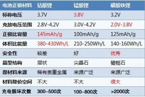 下表為磷酸鐵鋰電池和錳酸鋰、鈷酸鋰電池的幾個比較明顯的數據對比,主要通過標稱電壓、充放電壓范圍、體積比能量等幾大方面進行對比。