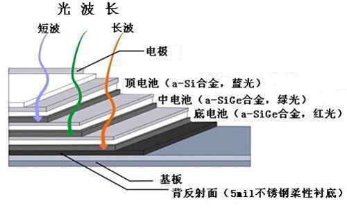 頂層使用非晶硅材料,光學能階間隙達1.8eV,利于吸收藍光。