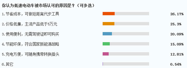 調查數據顯示,有26.17%的網友認為低速電動車普遍受到市場歡迎主要是因為在使用過程中可以“節(jié)省成本,并作為短距離代步工具”,這同時也是消費者對于低速電動車最基本的訴求。其次,有25.3%的網友選擇了“價格低廉,主流產品低于5萬元”這一選項,這基本上也符合低速電動車這一細分市場的定位。