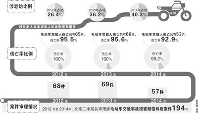 北京二中院分析發(fā)現(xiàn),涉電動(dòng)車交通事故損害賠償糾紛案件中,涉及老人或未成年人的比例逐年增多:2012年為26.4%,2013年為36.2%,2014年為40.3%。