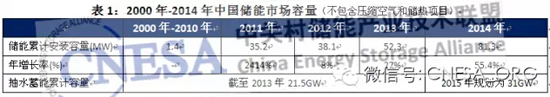 表1:2000年-2014年中國儲能市場容量(不包含壓縮空氣和儲熱項目)