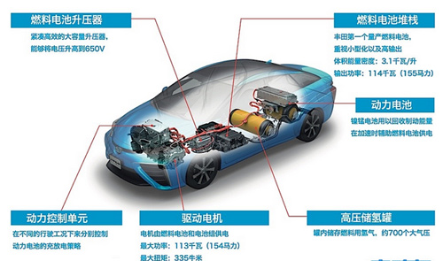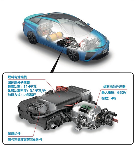 因為氫分子體積小,可以透過薄膜的微小孔洞游離到對面去,但是在穿越孔洞的過程中,電子被從分子上剝離,只留下帶正電的氫質子通過,氫質子被吸引到薄膜另一側的電極與氧分子結合。電解質薄膜兩側的電極板將氫氣拆分成氫離子(正電)和電子、將氧氣拆分成氧離子(負電)和電子,電子在電極板之間形成電流,兩個氫離子和一個氧離子結合成為純水,是反應的廢物。所以本質來講,整個運行過程就是發電過程。因此Mirai是純電動車,燃料電池堆棧代替的就是厚重且充電效率低下的鋰離子電池組。