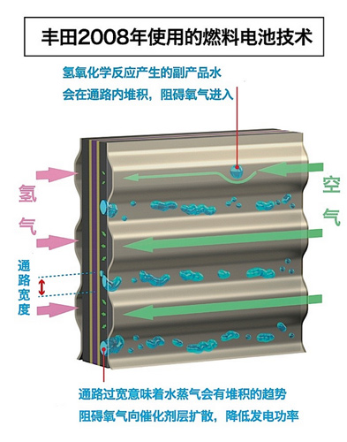豐田Mirai搭載的燃料電池堆棧是由370片薄片燃料電池組成的,因此被稱為“堆棧”,一共可以輸出114千瓦的發電功率。此前我們也分析了大眾集團的燃料電池技術,結構基本類似。豐田的燃料電池堆棧經歷了十幾年的技術優化,形成了自己的特色結構,比如3D立體微流道技術,通過更好地排出副產物水,讓更多空氣流入,有效改善了發電效率。所以整個堆棧的發電效率達到了世界先進水平,達到了3.1千瓦/升,比2008年豐田的技術整整提升了2.2倍。