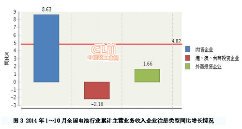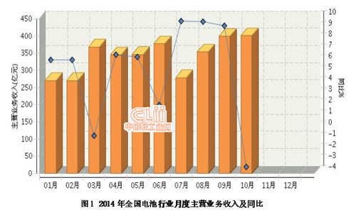 2014年1-10月,全國電池行業累計完成主營業務收入同比增長4.82%。其中:10月份完成主營業務收入同比增長-3.41%。(參見圖1)