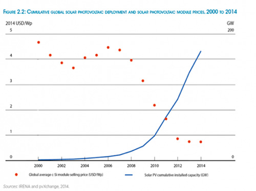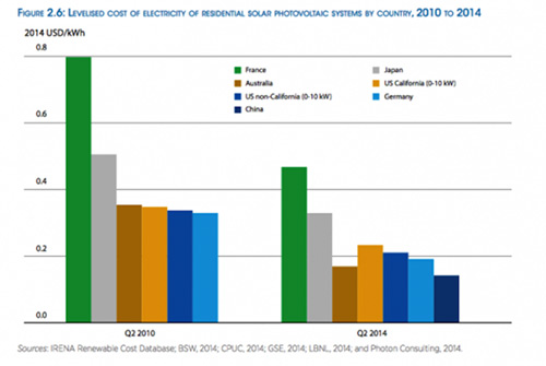 其中,太陽能是發電成本下降幅度最大的可再生能源。自2009年以來,太陽能光伏組件成本下降75%,住宅太陽能光伏系統發電成本較之2008年下降70%,從2010-2014年底,大型太陽能光伏發電成本下降高達65%。