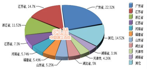 2014年1~11月全國電池行業主營業務收入較高的產區主要集中在廣東、江蘇、浙江、江西、河南、福建、山東、湖北、天津、湖南地區,十個地區完成主營業務收入占全國的85.48%。
