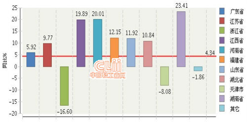 2014年1~11月全國電池行業主營業務收入同比增長較快的地區是湖南、河南、江西、福建、山東、湖北、江蘇地區。