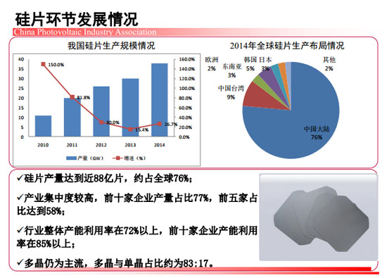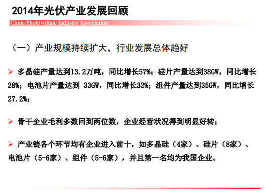 近期,中國光伏行業協會秘書長王勃華在“光伏行業發展與投資分析——2014年回顧與2015年展望”研討會上總結了去年我國光伏制造端以及應用市場的整體情況。