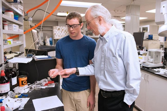 亞利桑那州立大學化學與生物化學系的Dan Buttry教授正與本科生Tylan Watkins測試電池樣品