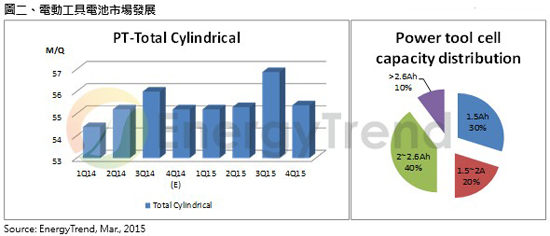 EnergyTrend指出,在IT需求逐漸走向輕薄化而減少電池芯顆數(shù)的趨勢下,動力工具更是電池芯廠積極加入的藍(lán)海市場;由于電動工具功率輸出較高,產(chǎn)品壽命要求也較為嚴(yán)苛,市場需求穩(wěn)定發(fā)展,然同樣面臨電池容量提升而使用顆數(shù)降低的現(xiàn)象,因此今年度鋰電池在電動工具市場需求仍維持持平局面,約占2.2億顆。