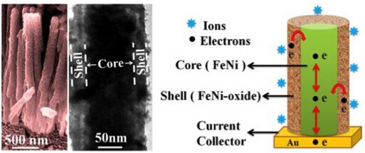 來自印度S.N. Bose國家基礎科學研究中心的兩位學者研發出了一種超級電容器,它的電極結構比較特殊,外殼層是由氧化鎳與氧化鐵組成的復合材料,內部包裹著導電性良好的鐵鎳合金。