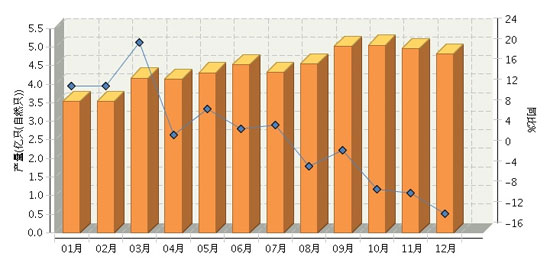 根據國家統計局公布數據,2014年1~12月,全國鋰離子電池行業累計完成產量同比減少0.03%。其中:12月份完成產量同比增長-12.3%。2014年全國鋰離子電池行業月度產量及同比如圖所示。