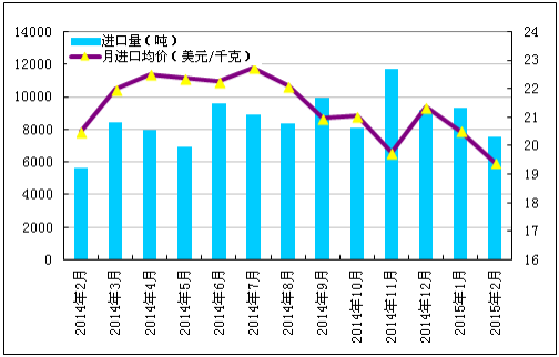 圖1 2014年2月-2015年2月多晶硅進口量及進口均價示意圖 數(shù)據(jù)來源:海關