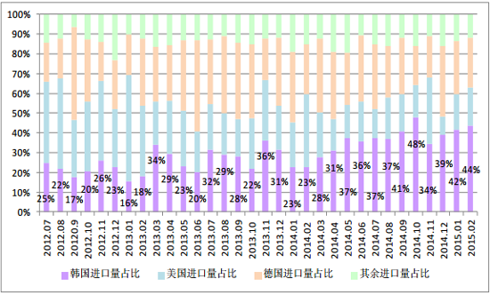 一、對于韓國最大多晶硅生產(chǎn)企業(yè)OCI征收2.4%的反傾銷稅對其根本不造成任何影響,故韓國向中國出口多晶硅無論按照一般貿(mào)易方式還是加工貿(mào)易方式都毫無顧忌,2月份從韓國進口多晶硅量達到3286噸,占當月總進口量的43.5%,依舊位居進口量首位,并遙遙領先于位居第二位的德國。因此,自韓國進口日漸猖狂是導致進口量很難大幅下降的主要原因。