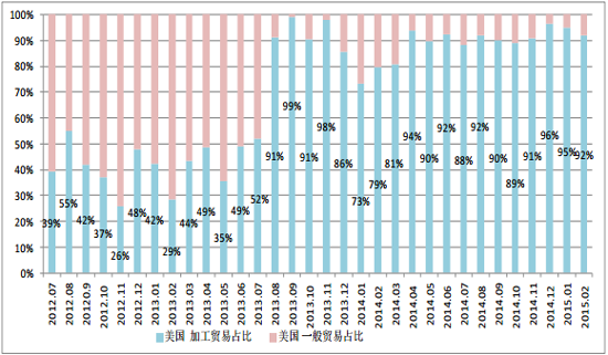 二、2月份自美國進口多晶硅1456噸,環(huán)比減少13.5%,但其中按照加工貿(mào)易方式進口量達1341噸,占當月從美國進口總量的92.1%,依然是加工貿(mào)易占絕對主導地位。自美國按加工貿(mào)易方式進口占絕對主導地位的現(xiàn)象始于2013年7月“雙反”立案后的8月份,之后加工貿(mào)易規(guī)避“雙反”的策略一直屢試不爽,從不間斷,因此從美國加工貿(mào)易進口一直占絕對主導地位是導致總進口量難以回歸合理范圍的另一重要因素。