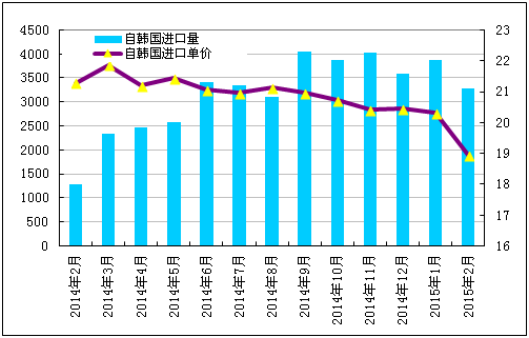 2015年2月份從韓國進口多晶硅量減少至3286噸,環(huán)比減少15.0%;2月份進口單價小幅下滑至18.95美元/千克,環(huán)比降幅為6.7%。