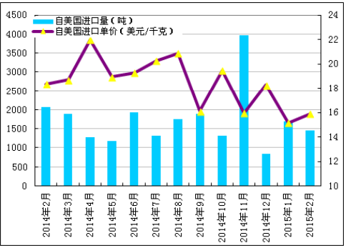 2015年2月份從美國進口多晶硅量減少至1456噸,環比降幅為13.5%;2月份進口單價微幅上調至15.90美元/千克,環比漲幅為5.0%。