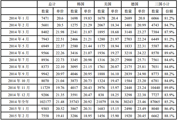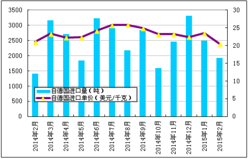 2015年2月份從德國進口多晶硅量減少至1920噸,環比降幅為22.9%;2月份進口單價小幅下滑至20.45美元/千克,環比下滑為12.9%。