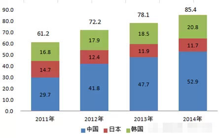從企業(yè)來(lái)看,日本和韓國(guó)企業(yè)仍占據(jù)小型鋰離子電池出貨量前四位,SDI、LGC、Panasonic和Sony的市場(chǎng)份額合計(jì)達(dá)到42.6%,其中Panasonic以圓柱形電池為主,尤其是在2013年和2014年其圓柱形電池在特斯拉電動(dòng)汽車的帶動(dòng)下,挽回了之前出貨量下滑的趨勢(shì),僅特斯拉電動(dòng)車給松下在2014年帶來(lái)的電芯需求就達(dá)到2.4億只左右。
