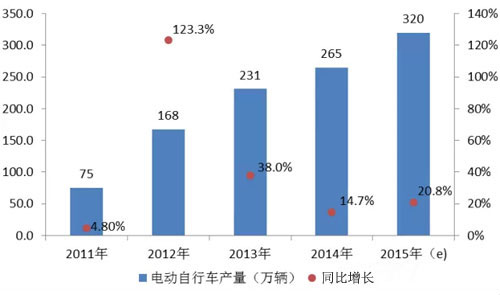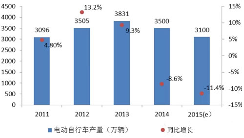2011-2015年中國電動自行車產量及增長情況
