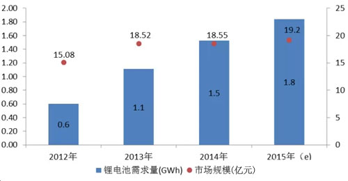 2012-2015年中國電動自行車用鋰電池需求量及市場規模
