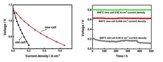 該團隊研制出了LSM-YSZ微納陰極電池,電池輸出性能是傳統LSM-YSZ陰極電池的2至3倍,并且在600℃至800℃下運行穩定。在LSM-YSZ微納陰極中,納米級LSM顆粒和YSZ顆粒的緊密接觸增加了三相反應界面密度,大幅度地提高了陰極的氧還原活性。同時,納米級LSM顆粒與納米級YSZ顆粒的界面穩定提高了陰極在運行條件下的穩定性。