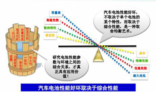 此外,動(dòng)力電池的各項(xiàng)性能是相互平衡的,或者 說“牽制”的,電池性能的優(yōu)劣不取決于單個(gè)電池的某項(xiàng)特性,而取決于綜合性能。從上圖中我們可以看出,容量與耐久性、高溫性能與低溫性能、散熱性與絕緣 性、容忍性與成本是四組互相“矛盾”的參數(shù)。因此,匡德志強(qiáng)調(diào),只有綜合考慮電池性能參數(shù)與環(huán)境之間的關(guān)系,才能真正具有應(yīng)用價(jià)值。