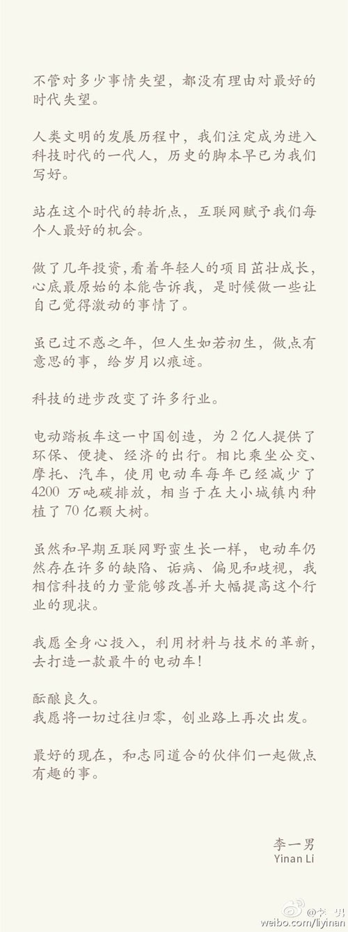 談起為何重新選擇創(chuàng)業(yè)的原因,李一男在微博中表示,做了幾年投資,看著年輕人的醒目茁壯成長(zhǎng),覺得應(yīng)該去做一些更讓人感覺到激動(dòng)的事情了。