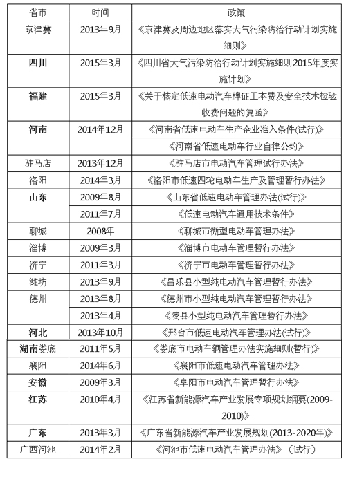 2013年,國(guó)家六部委印發(fā)的《京津冀及周邊地區(qū)落實(shí)大氣污染防治行動(dòng)計(jì)劃實(shí)施細(xì)則》中提出,“在農(nóng)村地區(qū)積極推廣電動(dòng)低速汽車(chē)(三輪汽車(chē)、低速貨車(chē))。”除了國(guó)家政策明確規(guī)定外,據(jù)不完全統(tǒng)計(jì),截至目前,全國(guó)已有近11個(gè)省份在全境或局部地區(qū)相繼為低速電動(dòng)車(chē)出臺(tái)管理辦法。