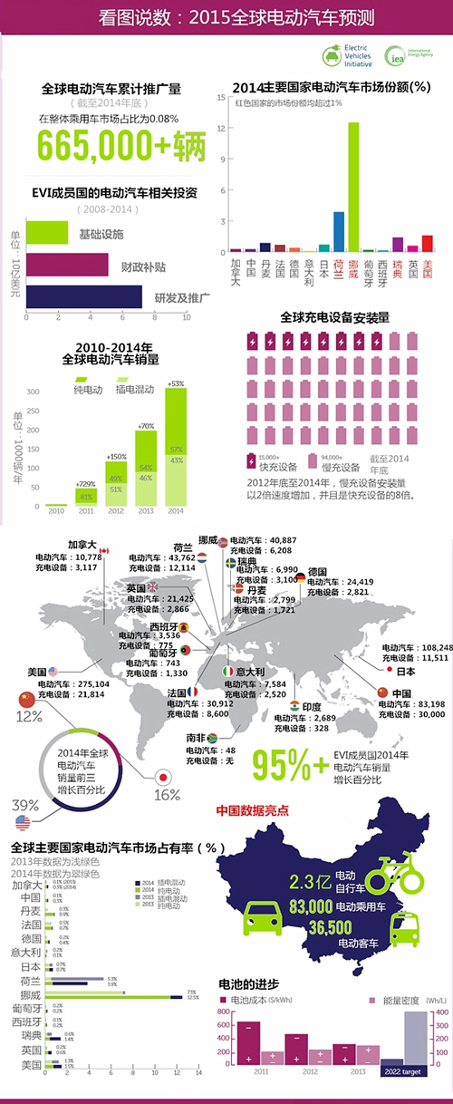 隨著各國家擴大公共充電基礎設施,為車充電也越來越容易。2012年至2014年,慢充數量增加了一倍多,快充數量增長8倍。EVI成員國現在已有超過10.9萬個充電點在運行中。報告還指出,2011年以來,電池成本價格下降了50%,能量密度也不斷上升,電動汽車的續航里程增加了,價格便宜了,這恰恰是消費者最關注的兩個基本點。